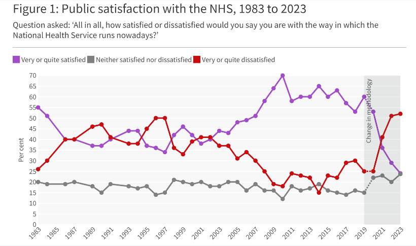 In the survey’s 41-year history, this was the first year that less than a quarter of people were “very or quite satisfied” with the NHS. This peaked in 2010, in the last year of the Tony Blair/Gordon Brown government when 7 out of 10 people were satisfied. The fall to 24% was from 29% in 2022, and 53% as recently as 2020.