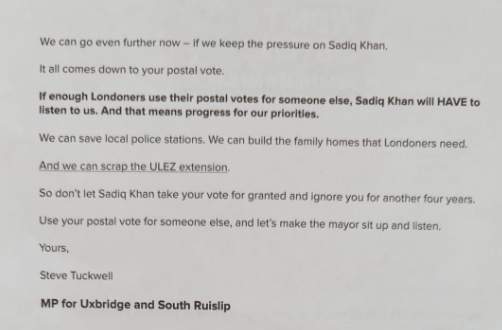 A letter written by Steve Tuckwell, Conservative MP for Uxbridge and South Ruislip aimed at postal voters, claims that “the Mayor thinks he is going to win this election easily. This means we have the chance to make a difference because if Sadiq wins by a smaller margin than he is expecting, he will be forced to sit up and listen”.