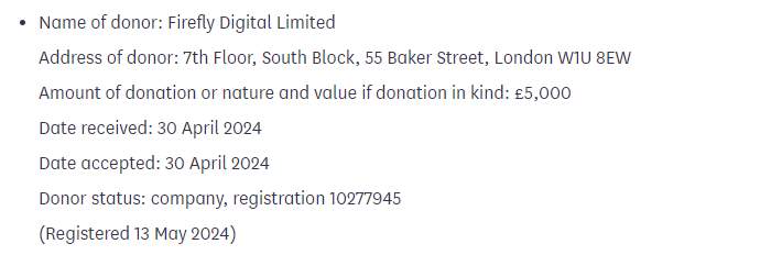 “The donation was made from Firefly Capital Limited, a UK trading company,” the spokesperson said. “Unfortunately, an administrative error at our end meant this donation was misregistered as ‘Firefly Digital Limited’.