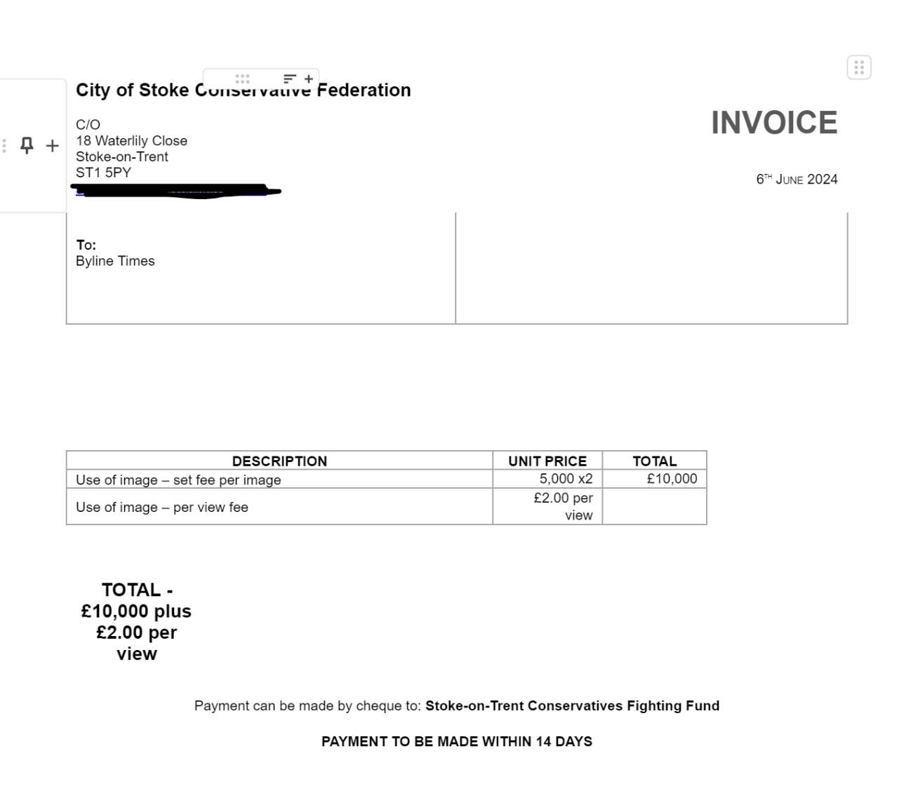Richardson demanded a sum of £5000 per image plus an extra £2 for every view. Out of transparency, Byline Times can confirm the article has been viewed 5,000 times adding another £20,000 to the total and bringing their full claim for ‘Stoke-on-Trent Conservatives Fighting Fund’ up to £30,000.