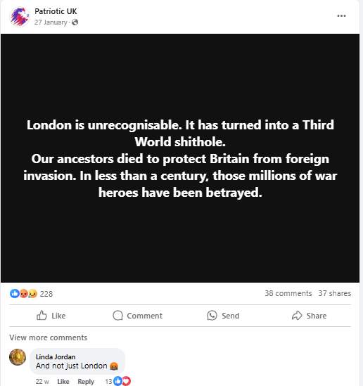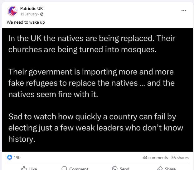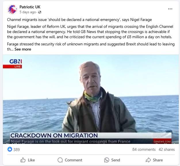 Patriotic UK also boosts these themes and reiterates them in its own nationalist style, highlighting both Anderson and Farage and the key message about migrants and Muslims.