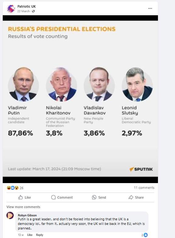 Two of the Facebook accounts identified as part of this pro-Kremlin network were called Common Sense Britain and UK Patriots – the latter doubly ironic given the account’s likely foreign origins – both of which appear to be big supporters of the Reform Party.