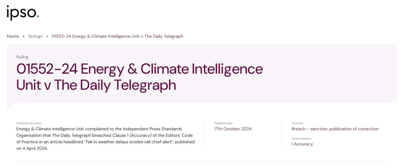 Following a six month back-and-forth with a climate think tank, the Independent Press Standards Organisation (Ipso) has now upheld a complaint against the newspaper over an article published in April this year, which claimed there had been a “fall in weather [related] delays” on the rail network.