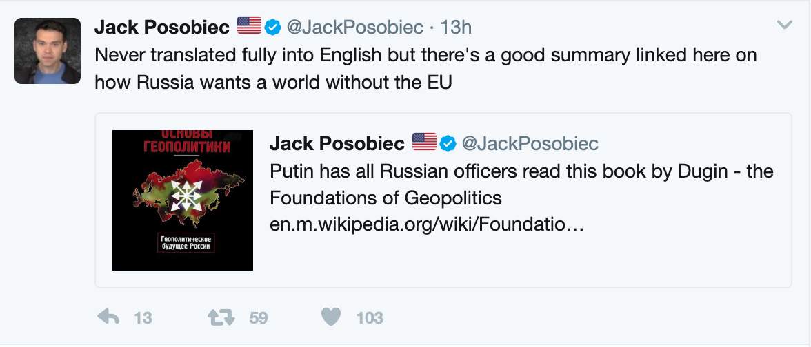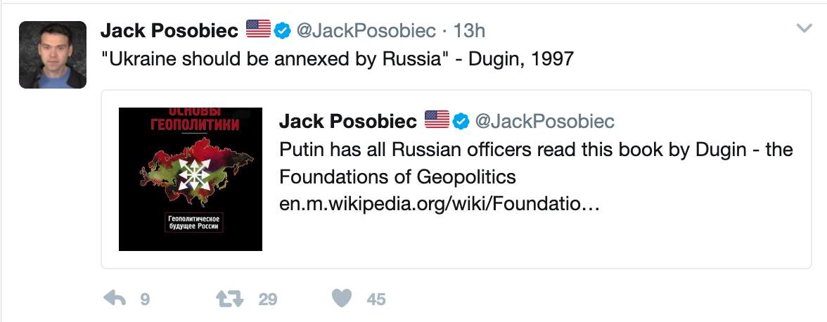 On his social media, he had long promoted the work of Russian neofascist Aleksandr Dugin, tweeting about Dugin’s 1997 book, The Foundations of Geopolitics. Excerpts include advocating for Russia to introduce “geopolitical disorder” in the U.S. by fueling sectarian and racial tensions. One of Posobiec’s tweets from April 23, 2017, directly quoted Dugin’s call for Ukraine’s annexation by Russia.