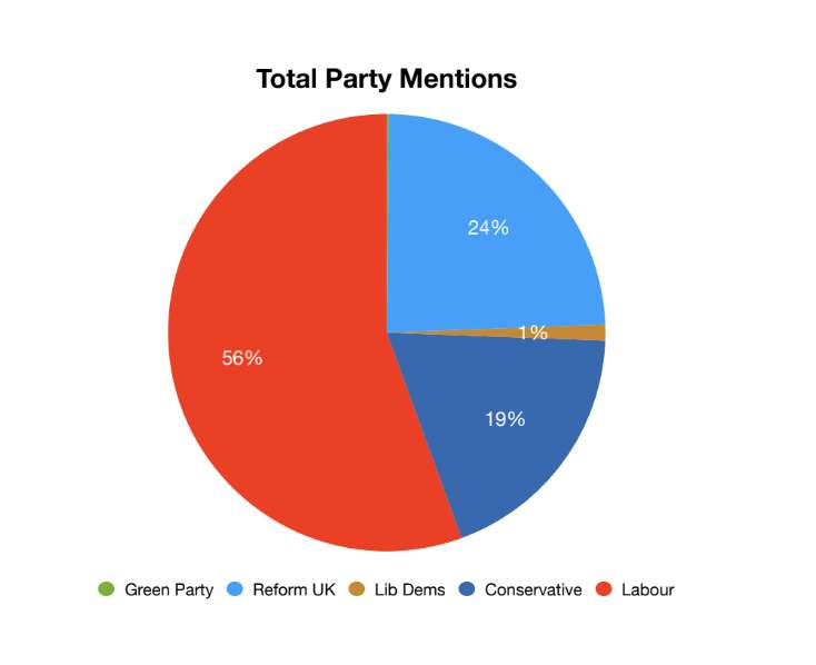 The LibDems are the real losers in the social media battle. With their strong showing of 72 MPs, they were only mentioned 46 times in one month across these outlets. Compare that to Reform’s 952 and you can start to see the trend.