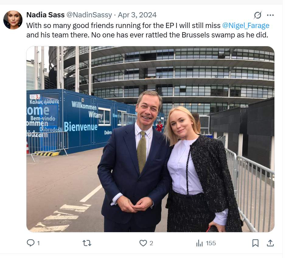 The picture appears to have been taken in 2018, but resurfaced again when Borodi posted it on X in April this year, from her hideout in Minsk, with the message: “I will still miss @Nigel_Farage and his team there. No one has ever rattled the Brussels swamp as he did.”