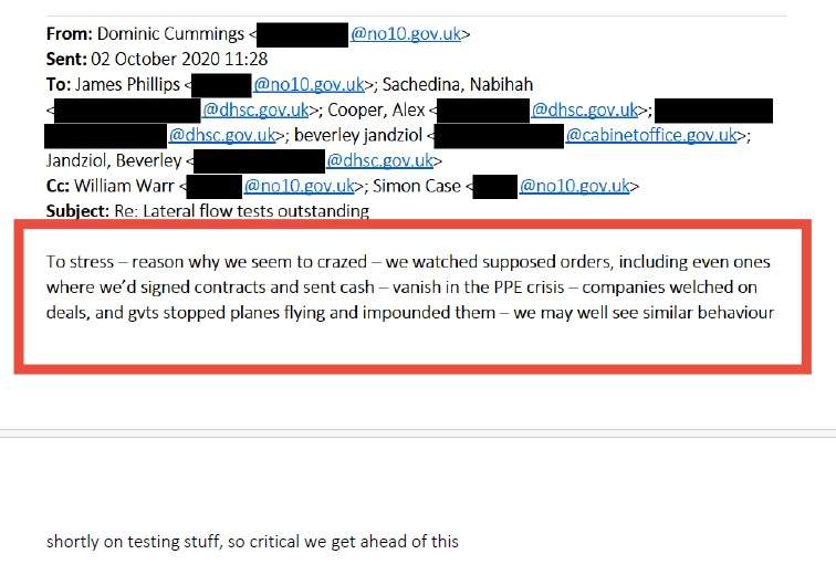 - In the rush to buy the Covid tests Cummings also gave his opinion on the highly controversial procurement of PPE by the previous Government.