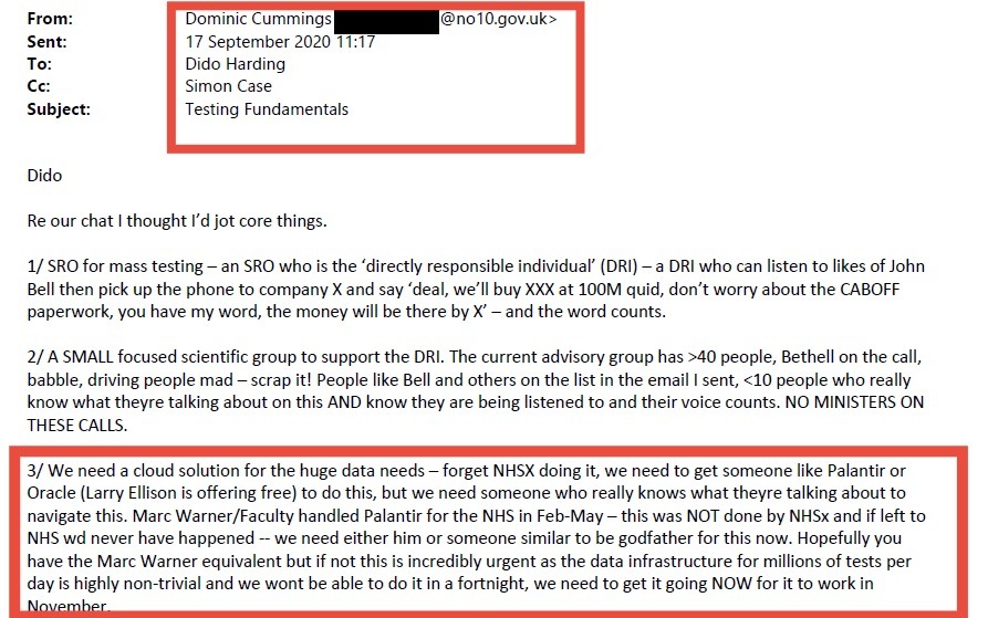 “Marc Warner/Faculty handled Palantir for the NHS in Feb‐May – this was NOT done by NHSx and if left to NHS wd never have happened… this is incredibly urgent as the data infrastructure for millions of tests per day is highly non‐trivial and we wont be able to do it in a fortnight, we need to get it going NOW for it to work in November”.