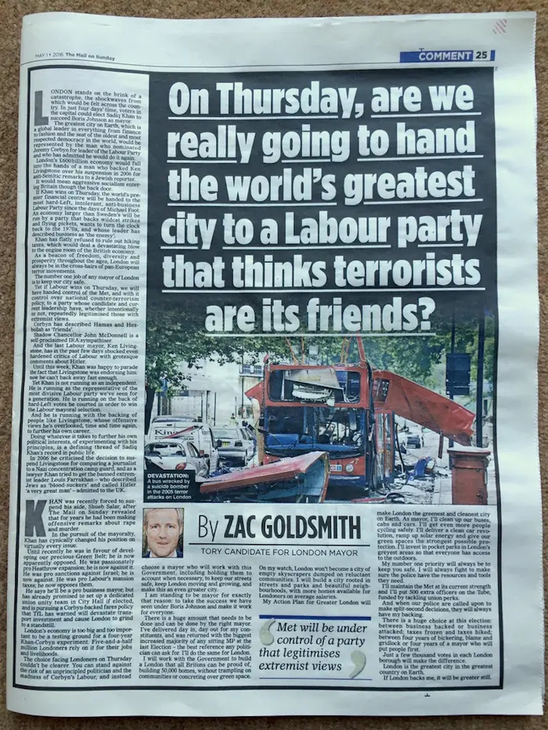 An article written by Goldsmith for the Mail on Sunday on the eve of the election was accompanied by a large photo of a blown-up London bus, with a headline suggesting that a vote for Khan would put the city into the hands of a party that “thinks terrorists are its friends”.