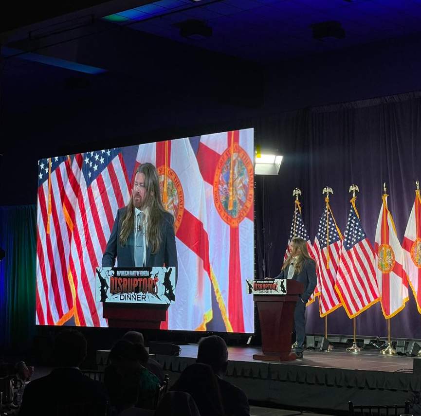 Alongside an all-star cast of Florida Republican stalwarts who took the stage of the fundraiser as Farage’s co-speakers was Adam Christian Johnson, also known as the ‘lectern guy’.