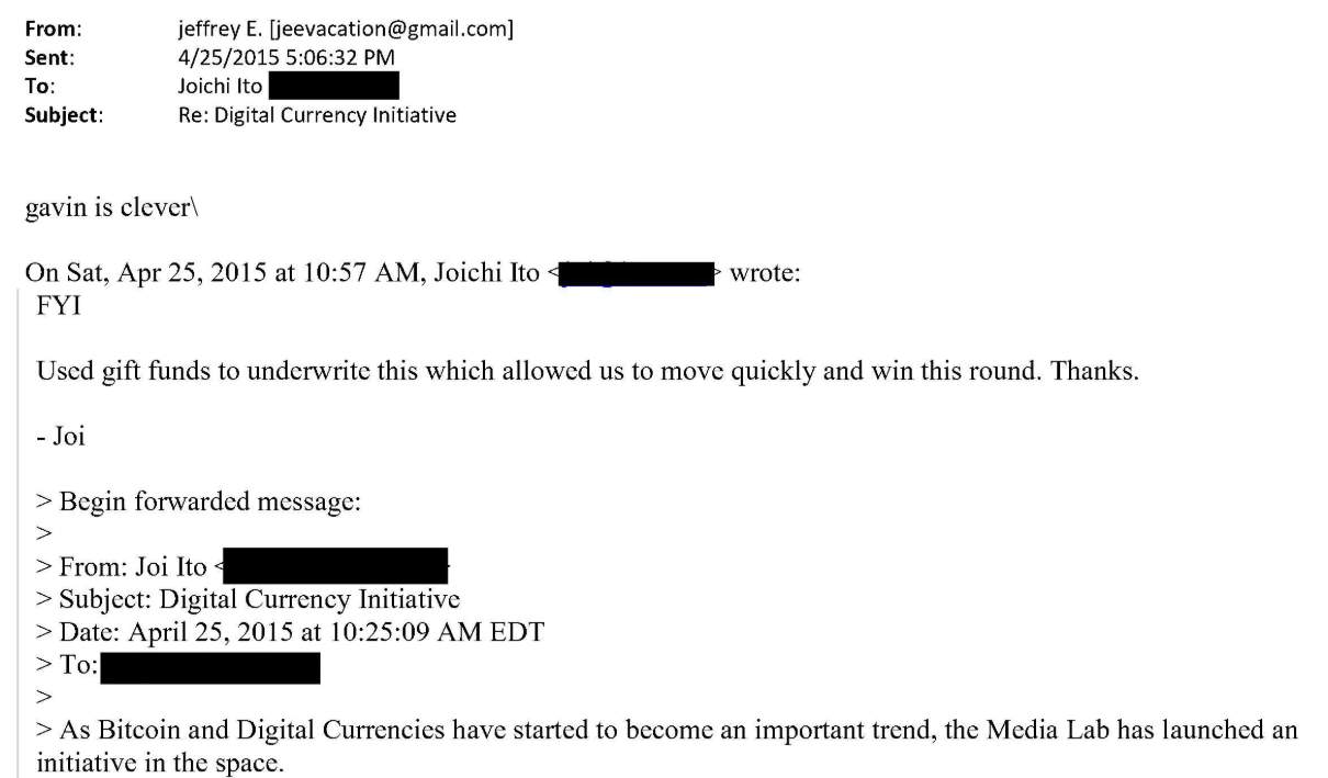 In a short note attached to the message, Ito was more direct: “Used gift funds to underwrite this, which allowed us to move quickly and win this round. Thanks.” Epstein replied: “gavin is clever.”
