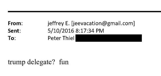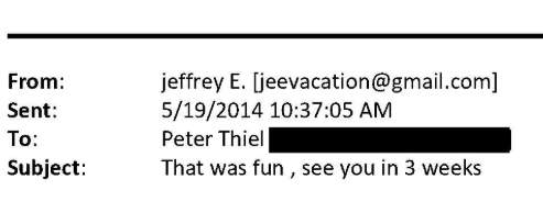 In May 2014, Epstein emailed Thiel, “That was fun, see you in three weeks,” confirming not only that they had already met, but that another meeting was scheduled.