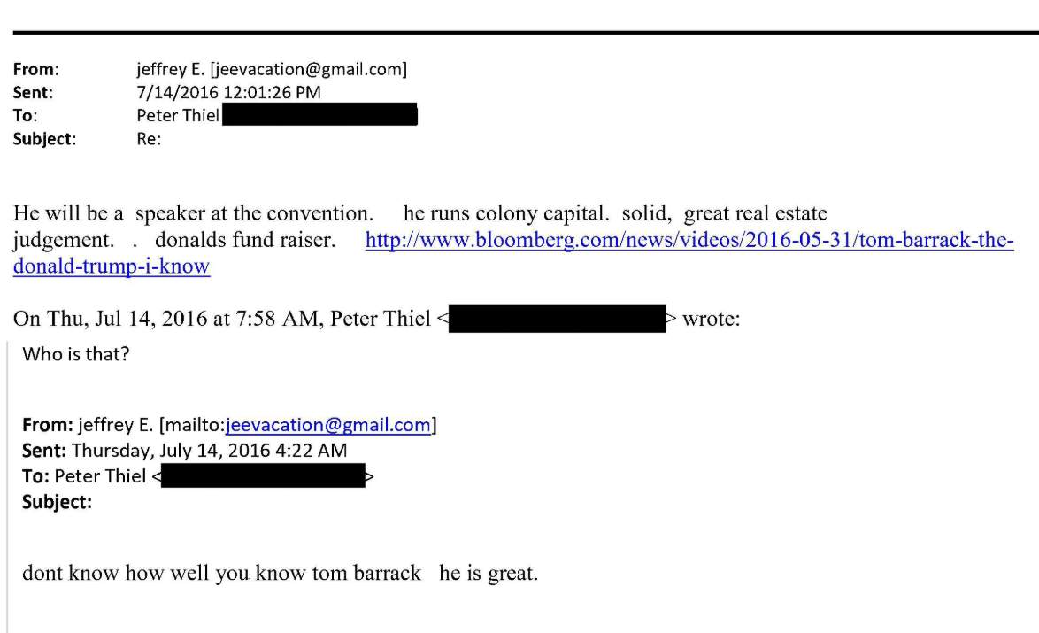 In another exchange that year, Epstein forwarded material about Tom Barrack, the real-estate mogul and Trump confidant who would later chair the Presidential Inaugural Committee. Epstein described him as a serious player in Trump’s orbit – nudging Thiel toward a closer awareness of the power structure forming around the man he just endorsed.