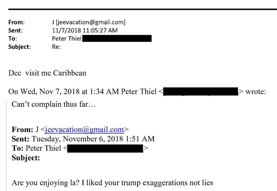 Epstein replied with another invitation – this time a suggestion that Thiel should visit him in the Caribbean that December.