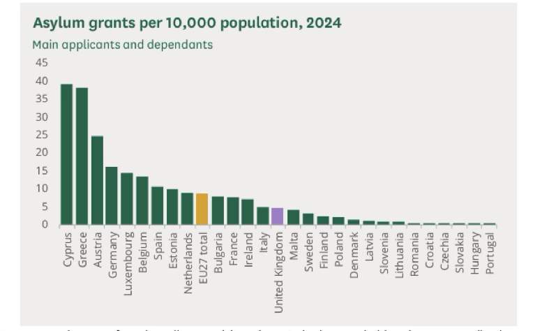 In terms of relative numbers, Cyprus had the largest number of asylum applications per 10,000 people (95) in 2024, followed by Greece (71), Ireland (35) and Spain (34).Across the EU27 there were 22 asylum applications for every 10,000 people. ), In 2024, there were around 16 asylum applicants for every 10,000 people resident in the UK. In terms of the number of positive asylum decisions granted at first instance per 10,000 population, in 2024, the UK granted around four positive asylum decisions for every 10,000 people. This is less than half the EU average where there were nine such grants for every 10,000 people.