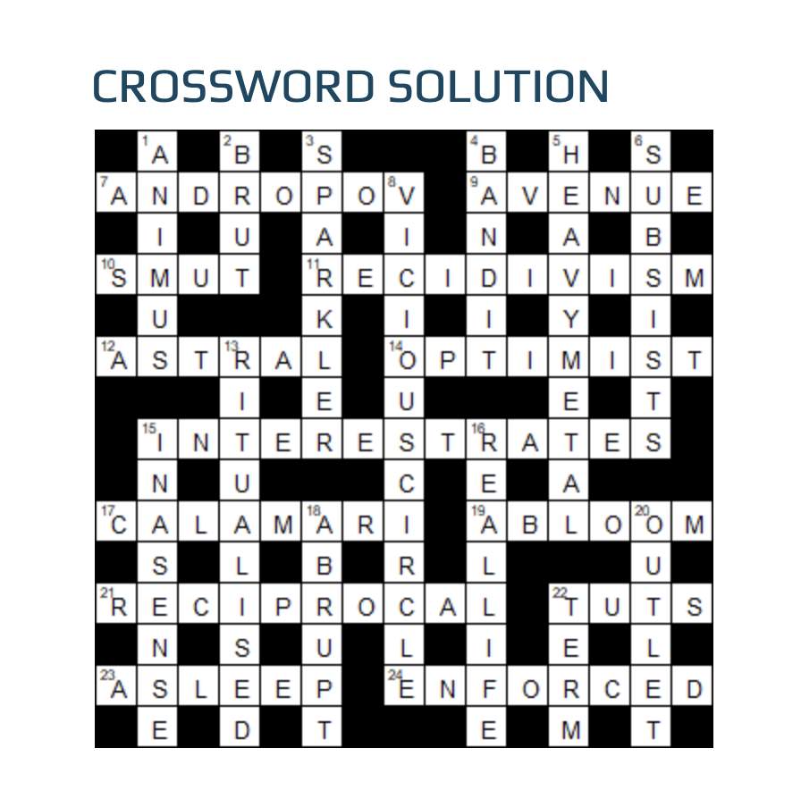 Across: 7 Anagram (forced) of VAN DOOR containing (outside) 1st letter (front of) Parliament = ANDROPOV (Russian boss once), 9 Venu (came from Val d’Isere, ie France) contained by (to reside in) the outer letters (outskirts of) AviemorE = AVENUE (a leafy street), 10 Middle letters (essentially) of words 2-5 = SMUT (pornography, dbe), 11 Anagram (drunk) of CIDER precedes (before) 4 (IV) followed by nondescript study (ISM, as in hard to classify study) = RECIDIVISM (return to bad ways), 12 Artist (RA) + 1st letter (initially) of (L)inkedIn follows (is after) A + way (ST) = ASTRAL (connected to the stars), 14 Ring (O) + IM, containing (downing) pint (PT) + first (IST) = OPTIMIST (I’m sure everything will be peachy), 15 Anagram (explosive) of SETTER IN TEARS = INTEREST RATES (charges), 17 Wreck (MAR) in French port (CALAIs) minus the last letter (hampered) = CALAMARI former ink producers, seeing as they are now cooked!), 19 LOO (toilet) in (aboard) rocket (ABM, antiballistic missile) = ABLOOM (open), 21 Endless ingredients (RECIPe) + what’s left of Rioja (R) + pub (lOCAL) minus 1st letter (late-opening) = RECIPROCAL (joint), 22 Deleting (neglecting) ‘den’ (study) STUdenT is reversed (returns) = TUTS (chorus of disapproval), 23 When (AS) + homophone (told) of to jump (LEEP/leap) = ASLEEP (crashed out), 24 In respect of (FOR) + church (CE) divides (cuts) limit (END) = ENFORCED (imposed).