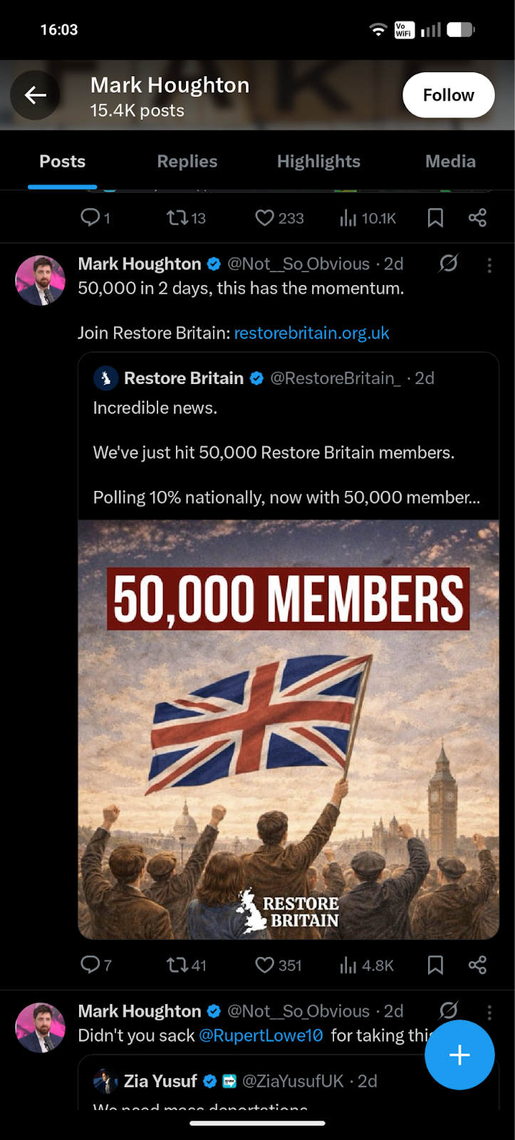 On 1 December 2025, Mitchell reposted an announcement by Lowe regarding Great Yarmouth First, writing: “… finally something we desperately needed. Sign me up!” Rupert Lowe responded to him directly: “Welcome to the team mate!”.