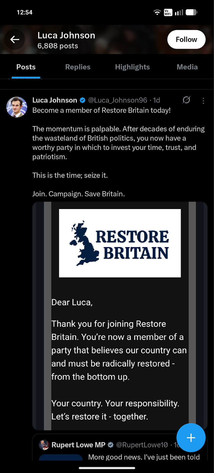Restore Britain has also been promoted online by Mark Houghton and Luca Johnson of the Lotus Eaters podcast. Fellow Lotus Eaters contributor Charlie Downes has been on the campaign trail with Rupert Lowe promoting the party.