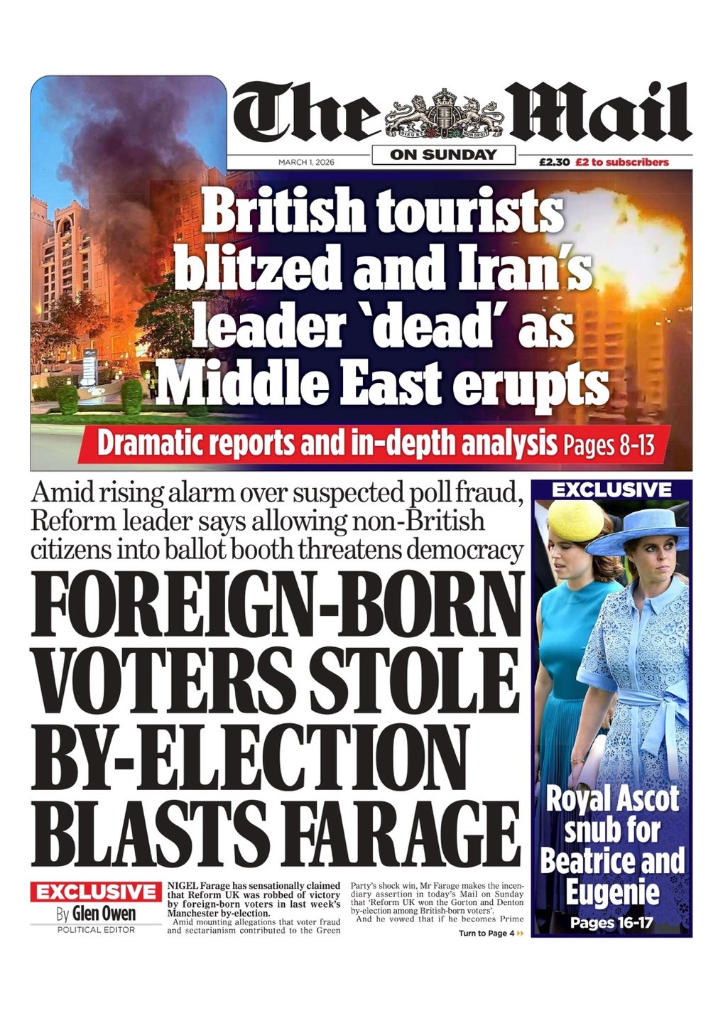 On Sunday, Britain’s right-leaning newspapers – particularly the Mail – helped trumpet Farage’s evidence-free claim that the election had been “stolen”, with Farage insisting without evidence, that: “Reform UK won the Gorton and Denton by-election among British-born voters.”