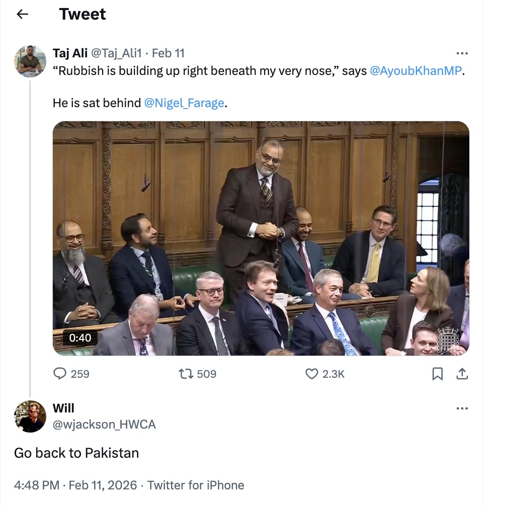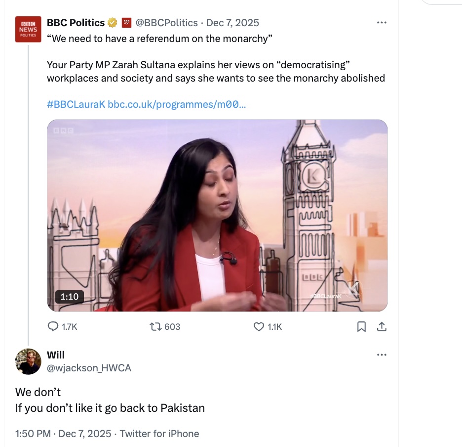 - Posts telling Zarah Sultana, who was born in Birmingham, to “go back to Pakistan” and calls for her to be deported
