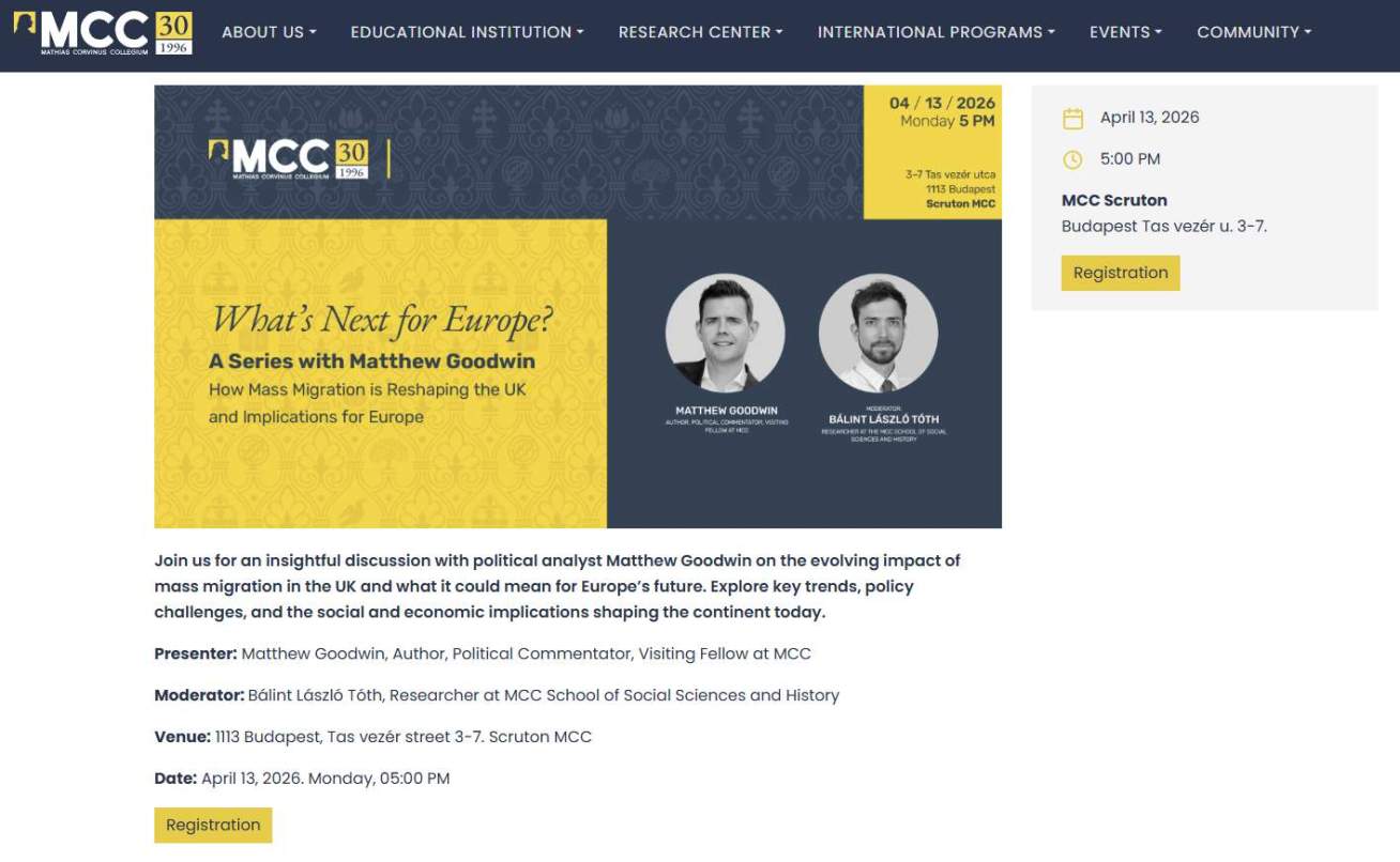 Despite the defeat, Goodwin is scheduled to speak on a panel today (13th April) on “how mass migration is shaping the UK” at an MCC venue in Budapest. It may be the last such event for some time if Tisza, which secured a landslide in Sunday’s elections, overhauls the institution as planned.