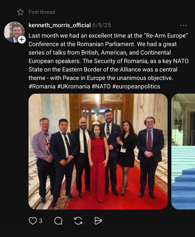Morris is active in wider European hard-right networks. In a post on his Threads account last year, he said he “had an excellent time” at the Re-Arm Europe Conference in Romania.