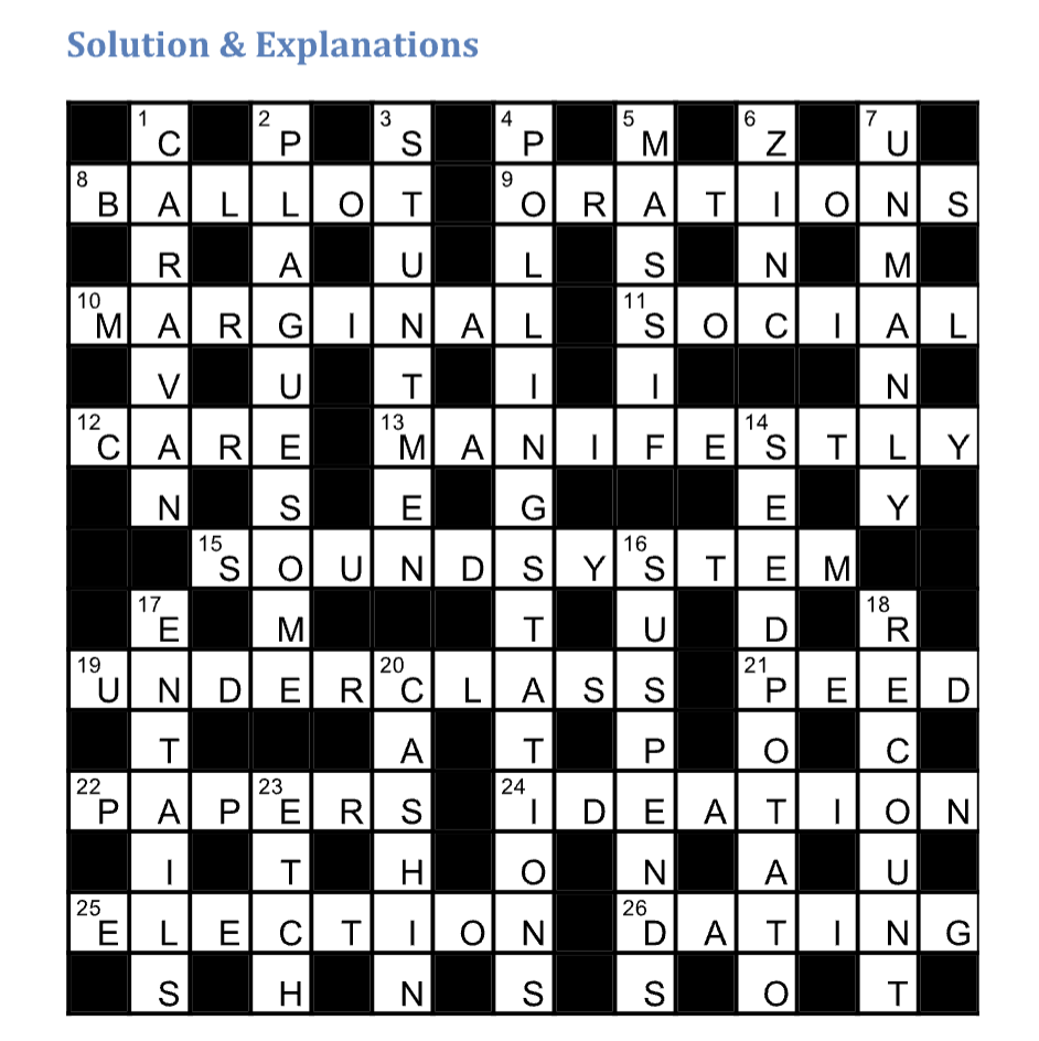 Across: 8 Reversing tax (TOLL) on (juxtaposition) arts degree (BA) = BALLOT (vote) Thematic: X marks the spot (see also student fees), 9 No (O) + food (RATIONS) = ORATIONS (addresses) Thematic: anyone seen the telly recently?, 10 Spread (MARG) + everything (ALl) minus last letter (virtually) containing (over) hot (IN) = MARGINAL (seat) Thematic: for younger subscribers, this is happens a lot when there is a close election, 11/12 Party (SOCIAL) + alternate letters (from time to time) of ChAiRmEn = SOCIAL CARE (support) Thematic: the one policy area all parties have ‘a plan’ for, but are afraid to touch., 13 Anagram (is wrong) of ANY LEFTISM = MANIFESTLY (clearly) Thematic: loosely linked to all those manifesto promises that are clearly bollocks, 15 Cryptic/whimsical definition. Thematic: used at every rally, 19 DD if read “under (slightly less than) + class (perfection)” and underclass (the poor of a country) Thematic: the citizens all politicians claim to care about but…, 21 A long way (DEEP) reversed = PEED (went) Thematic: how 19a feel (usu. with off or upon), 22 DD Thematic: who decides elections (see also Mail), 24 I would (ID) have dinner (EAT) + (with) ten (IO) + 1st letter (at first) of (N)ovelists = IDEATION (the generation of new concepts) Thematic: well, it would be lovely, wouldn’t it?, 25 Anagram (busy) of middle letter (essentially) of cand(I)date + ETON CoLlegE minus (wanting) leg and minus (-) (o)ver = ELECTION (choice), 26 1st letters (starts to) of (I)nstall (N)ew (T)echnology after (following) all but the last letter (a great deal) of information DATa = DATING (going out).