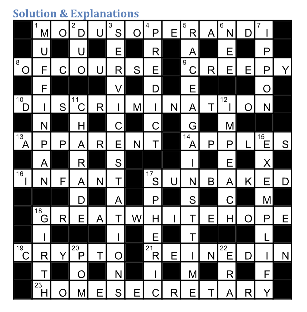 Across: 1 SPIDERMAN + 1st letters (initially) of (D)ismisses (U)mpteen (O)fficial (O)bjections anagrammed (after adjusting = MODUS OPERANDI (his way of working), 8 Astray (OFf COURSE) minus one f (one fellow goes) = OF COURSE (predictably), 9 Take a look (PEER) reversed (around) inside the outer letters (outskirts) of (C)aerphill(Y) = (it’s) CREEPY (horrible), 10 MINIONS + CARDITIS anagrammed (struggling) minus 1st letter (losing primarily) of smell = DISCRIMINATION (taste), 13 Mum (PARENT) as dbe (for one) after (joins) pAPa minus outer letters (naked) = APPARENT (pretty obvious), 14 Alcoholic drinks (ALES) containing outer letters (peel) of P(lump)P = APPLES (fruits), 16 Wind instrument (FAN) inserted into (used during) current (IN) + T (opening of theatre) = INFANT (early), 17 Reversal (returning) of students (NUS) + BED (from the clue) containing (eating) middle letters (essentially) of cAKe = SUNBAKED (that’s bone dry and hard), 18 Expectation (HOPE) follows terrific (GREAT) + wine (WHITE) = GREAT WHITE HOPE (historically one people wanted to succeed), 19 Shout (CRY) + an alert that there’s something on the back (PTO) = CRYPTO (suggestive of hidden beliefs, eg Crypto-Judaism), 21 Thatch (as a verb, REED) containing (covering) popular (IN) + homophone (as told) of pub (IN)n = REINED IN (checked), 23 Accommodate (HOME) + writing desk (SECRETARY) = HOME SECRETARY (Office manager – manages the Home Office) .
