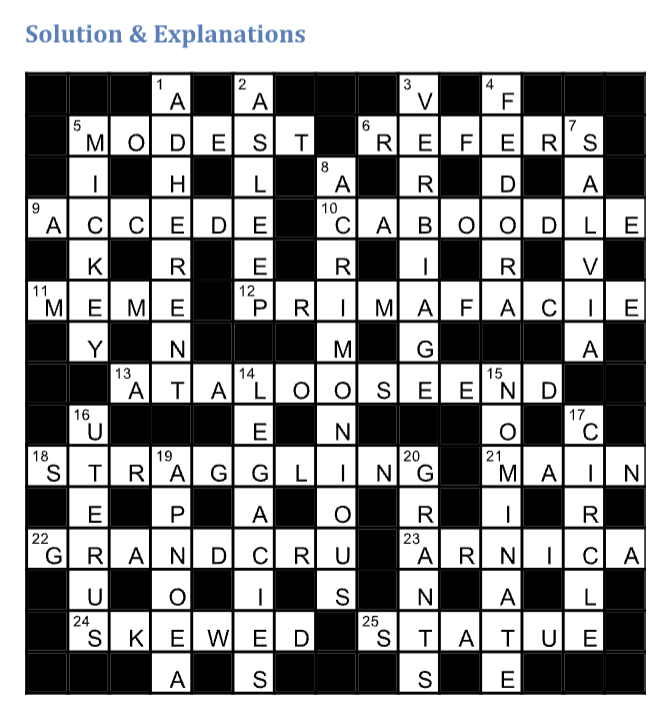 Across: 5 Manner (MODE) + way (ST) = MODEST (humble) Note: using ‘dwelling in’ in the sense of existing/living/to be found in to indicate the wordplay, 6 Remove 1st letter (losing a bit) of (e)lasticity from joints (ReEFERS = REFERS (mentions) note: I considered if an indicator is necessary for removing either the 1st/2nd ‘e’ but felt not as the key to the clue is joints –> reefers and the rest is obvious., 9 Current (AC) + homophone (being announced) of top player (seed/CEDE) = ACCEDE (agree to), 10 Lackey (pOODLE) minus 1st letter (quietly goes) next to (by) taxi (CAB) = CABOODLE (a lot), 11 Twin composers = ME (as the composer of the puzzle) x 2 = MEME (picture), 12 Anagram (must be rearranged) of CAMPFIRE + central letters (essentially) of entert(AI)nments = PRIMA FACIE (at first glance), 13 John (LOO) in America (stateside) spotted (SEEN) inside information (DATA) with 1st letter moved to last (circulating) = AT A LOOSE END (having nothing better to do), 18 Anagram (getting in a tangle) of GAL + GSTRING = STRAGGLING (untidy), 21 Reversal (returning) of in the morning (AM) + on good terms (IN) = MAIN (chief), 22 Case of (C)hatea(U) containing (bottled) initial letter of (R)othschild following 1st letters (foremost of) (G)rapes (R)ipening + AND = GRAND CRU (premium wine), 23 Answer is hidden (made by some) in populAR NICAguans = ARNICA (application), 24 Outside letters (cleared out) of (S)pringbo(K) + inner letters (naked) of s(EWE)r + (D)ied = SKEWED (biased), 25 Anagram (surprisingly) of ASTUTE = STATUE (perhaps Colston, DBE ref. the erection famously cast into the harbour by the good folk of Bristol).
