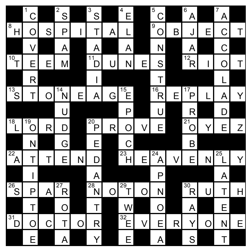 Across: 8 SHOAL (lots of fish) minus 1st letter (appearing headless) around (either side of) promontory (SPIT) = HOSPITAL (institution conducting research) RE the definition King’s College Hospital, as an example, have as their top-line description “We are a research-active organisation. Research is a key part of our strategy, and every year thousands of people take part in research studies at the Trust.”, 9 This writer in Paris (JE) + catches (CT, the abbreviation used in Wisden for catches taken) following (on) OB (outside broadcast) = OBJECT (protest) Eg https://www.espncricinfo.com/records/trophy/fielding-most-catches-career/the-wisden-trophy-4, 10 Reversal of (on the qay back)come face to face with (MEET) = TEEM (bear), 11 Greyish brown (DUN) + outer letters (cleared out) of E(ffluent)S = DUNES (mounds), 12 Last letter (in the end) of dal(I) inserted into (cuts) rhubarb (ROT) = RIOT (display), 13 Metallica single (ONE which was a single for the group and which happily also means single) inserted into (during) part of development (STAGE) = STONE AGE (period preceeding Metal), 16 Race (RELAY) containing (around) 1st letter (left side of) P(itch) = REPLAY (another game), 18 DD, 20 For (PRO) + reversal of Tesla? (dbe of EV) = PROVE (test), 21 Reversal of ZErO (when love is over) with (r)un replaced (away) by a (Y)ear = OYEZ (cry), 22 AT (from the clue) + just after 9.59 (TEN) + 1st letter (tip from) D(ay) = ATTEND (nurse), 23 But o(NLY) minus 1st letter (loses head) following gag (HEAVE) = HEAVENLY (delightfuĺ), 26 DD, 28 DD, 30 To populate (RUT) + character facing H(angman) = RUTH (once, being archaic, a matter for pity), 31 DD, 32 Time (EON) on E(arth) contains (is entertaining) VERY (to a large extent) = EVERYONE (all).