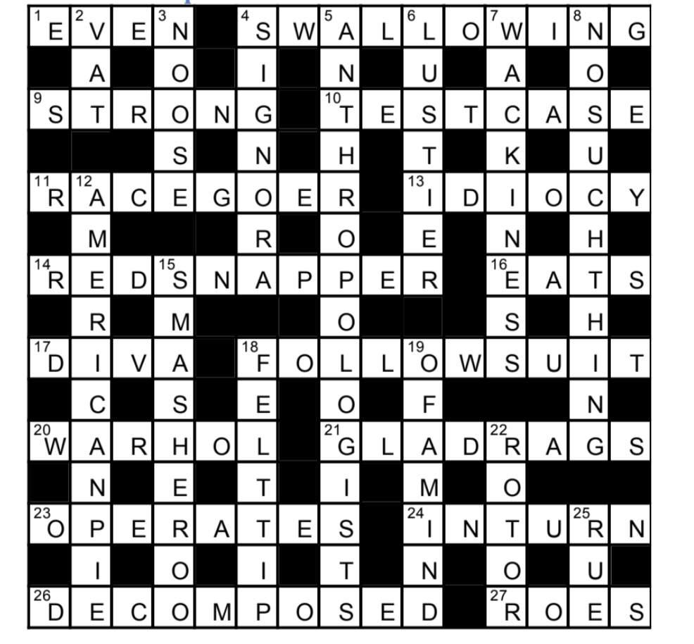 Across: 1 Income (rEVENue) minus (lost) regret (r…ue) = EVEN (flat), 4 Last letter (what winds … up) of dietician(S) + indulging oneself (WALLOWING) = SWALLOWING (eating), 9 Sequence of binary characters (STRiNG) changing (switching) on to off (I –> O, in binary code) = STRONG (powerful), 10 Anagram (repaired) CASSETTE = TEST CASE (an experiment), 11 Alternate letters (regularly) of fErRiEs + CARGO anagrammed (all over the place) = RACEGOER (someone attending meetings), 13 Officer in charge (CO) reversed (turning) following (on) former Ugandan leader (IDI) + a Y(ear) afterwards (later) = IDIOCY (foolishness), 14 Liverpool fans (REDS) + anagram (playing) of NEAR + 1st letter (top end) of P(itch) + last letter (close to) of (ko)P = RED SNAPPER (something you might catch), 16 Saddle (SEAT) with front letter moved to back (cycling) = EATS (is irritating), 17 DAVId minus last letter (when snubbed) anagrammed (could be) = DIVA (a prima donna), 18 Tracks ( FOLLOWS) + 1st letters (elements of) U(sual) I(ndie) T(hemes) = FOLLOW SUIT (imitate), 20 WHOLe (unabridged) minus last letter (virtually) with A + (R)are included = WARHOL (rare), 21 CD, 23 Anagram (edit) of A POSTER with (E)uropean inserted = OPERATES (acts), 24 Reverse (reject) boring course (RUT) in hotel (INN) = IN TURN (one after the other), 26 Whimsical reading of DECOMPOSED (rotten) as how music is deconstructed, 27 Homophone (according to report) of rose (increased in price) = ROES (eggs).